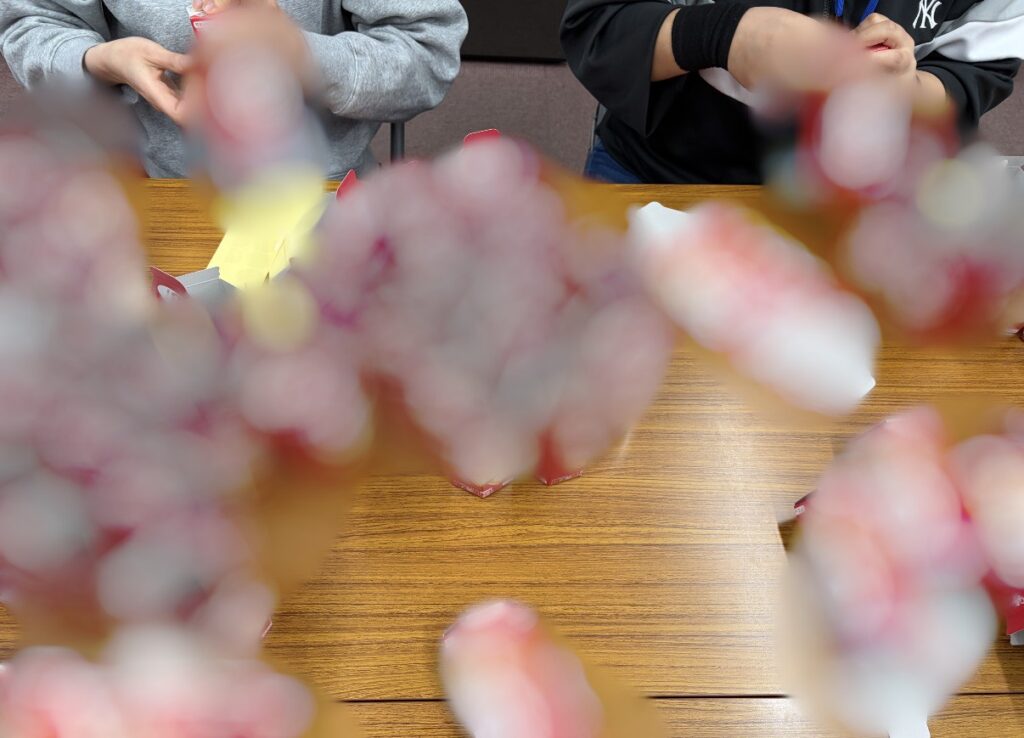 スタッフが組み立てたお菓子の箱に、利用者さんに中身を詰めていただきます🎁