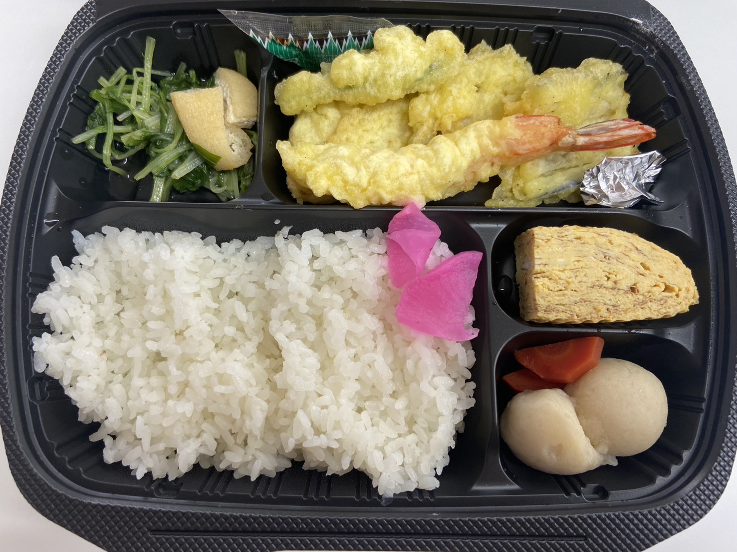 ごはんには、鮮やかな桜漬けがアクセントに。ひと口ごとに爽やかな風味が広がり、最後まで飽きずに楽しめるお弁当になっています。